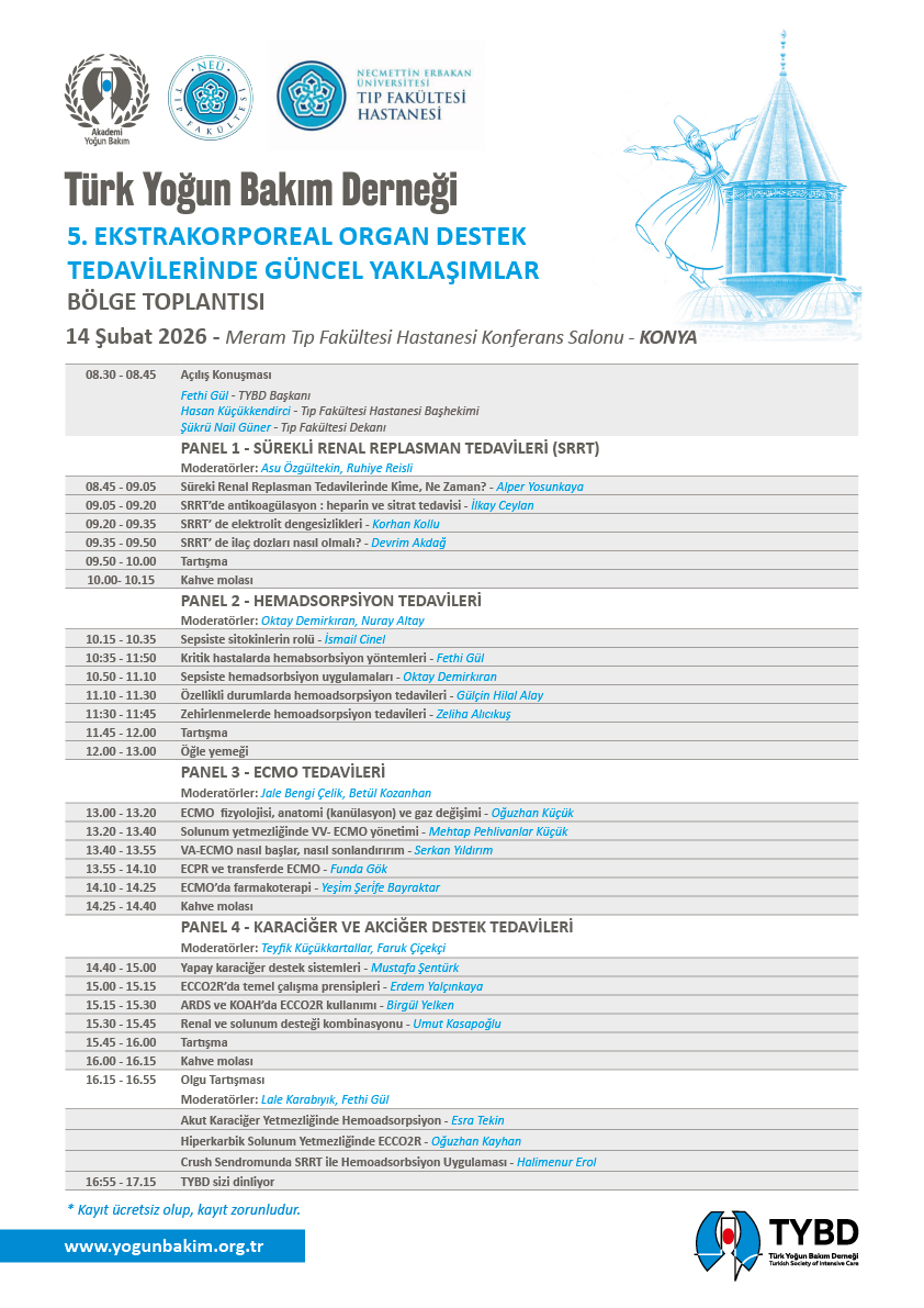 Türk Yoğun Bakım Derneği 5. Ekstrakorporeal Organ Destek Tedavilerinde Güncel Yaklaşımlar Bölge Toplantısı 14 Şubat 2026 tarihinde Konya NEÜ Tıp Fakültesinde gerçekleştirilecektir.