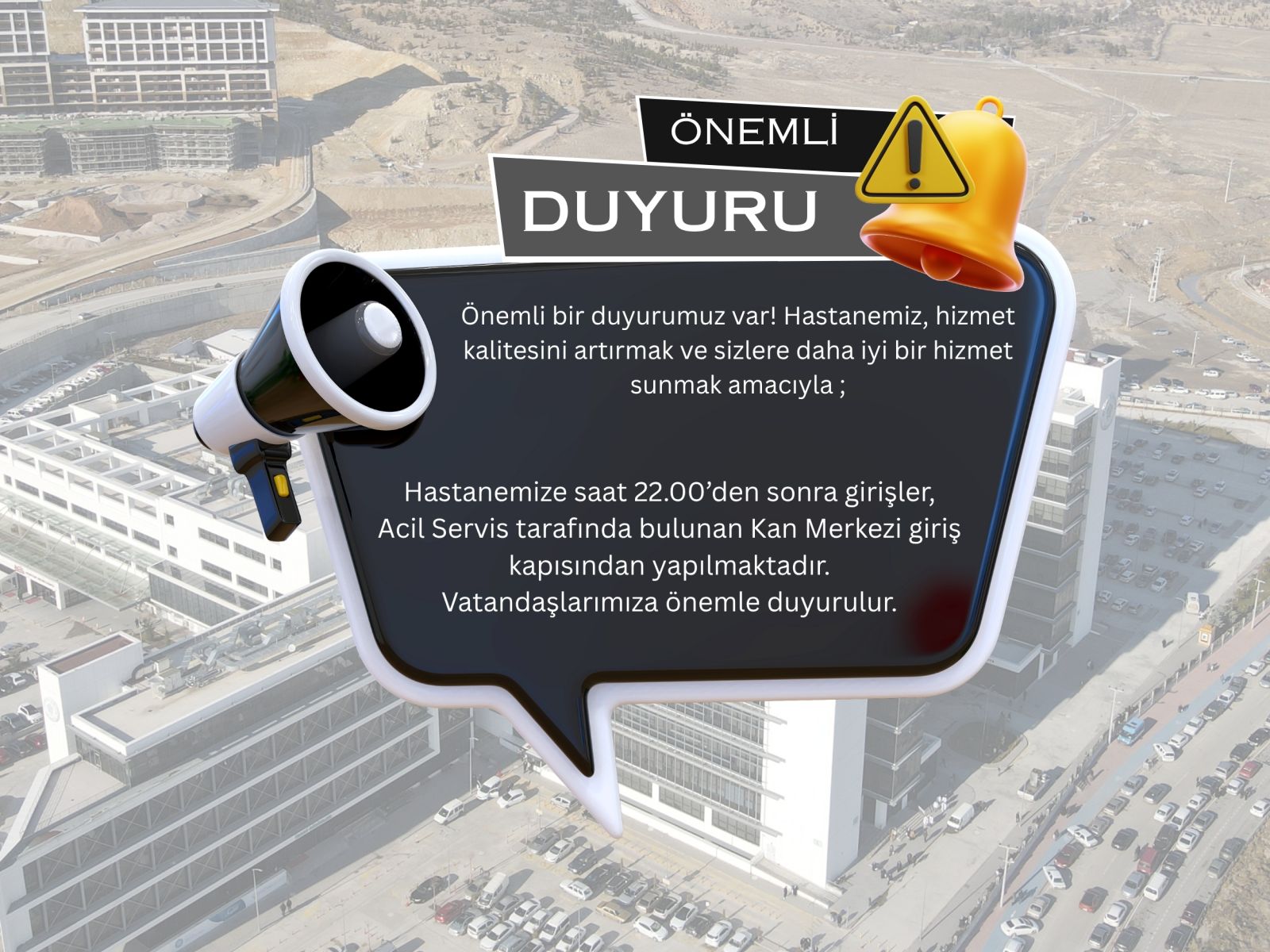 Hastanemize saat 22.00’den sonra girişler, Acil Servis tarafında bulunan, Kan Merkezi giriş kapısından yapılmaktadır. Vatandaşlarımıza önemle duyurulur.